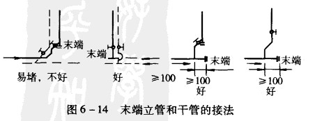 4.安裝時應該注意末端立管和干管的接法,避免因泥砂堵塞造成最后一根立管上的加熱盤管堵塞,見圖6一14所示。