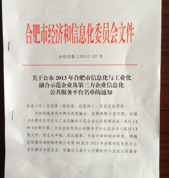以下為合肥市經(jīng)濟(jì)和信息化委員會(huì)頒發(fā)證書(shū)及紅頭文件:
