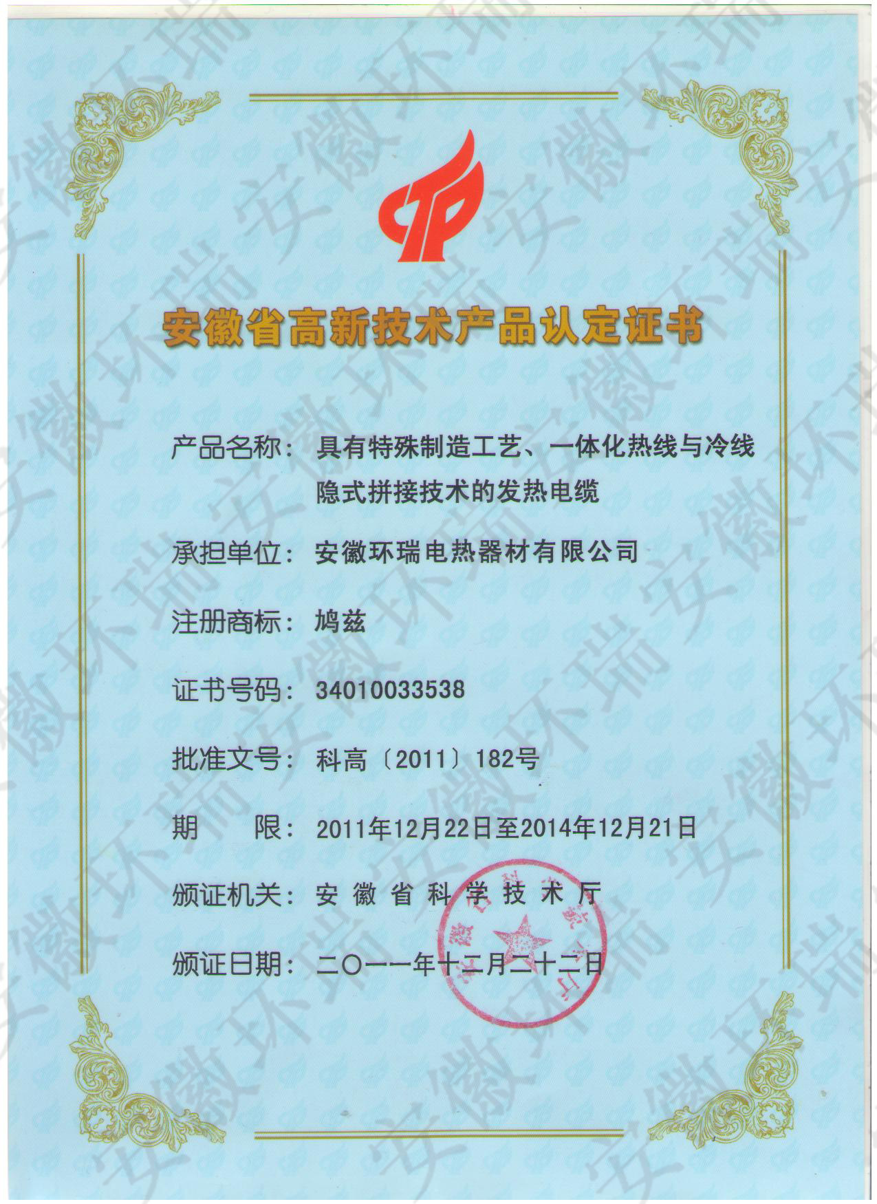 【喜訊】熱烈慶祝安徽環(huán)瑞獲得省科學(xué)廳發(fā)熱電纜高新技術(shù)產(chǎn)品
