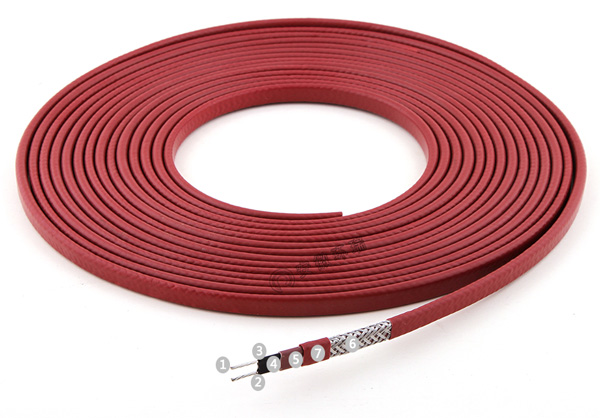 1、銅芯導線 2、低電阻過渡層 3、PTC芯帶  4、改性聚烯烴絕緣層  5、改性聚烯烴絕緣層  6、金屬屏蔽層  7、低煙無鹵外護套(可定制氟塑料護套)